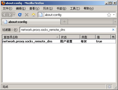 在Firefox设置 SOCKS远程域名解析,主要是为了防止DNS污染,具体设置方法是,在Firefox地址栏中,输入 about:config ,按确认,修改里面的一项数值,改成 network.proxy.socks_remote_dns=true 就可以了。